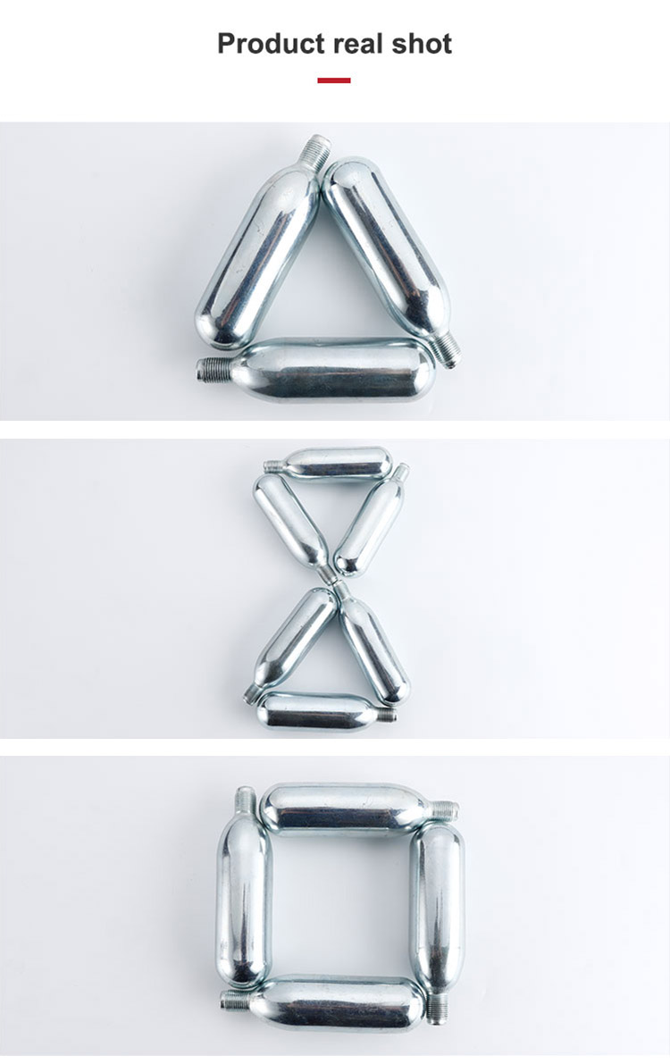 Setiap silinder mengandungi 74g karbon dioksida, cukup untuk mendorong dan menampung 14 atau lebih tong. Gas karbon dioksida yang diluluskan oleh kilang minuman gred minuman dikimpal pada setiap silinder untuk mengekalkan ciri kesegaran. Boleh dipercayai dan selamat. Ia membolehkan pengguna menikmati mobiliti dan kemudahan penggunaan. Gunakan kartrij CO2 yang dihasilkan secara besar-besaran secara ekonomi. Kaedah baru bir atau soda menggunakan karbon dioksida sebagai bahan dorong. Dimensi: 140mm panjang, 40mm diameter. Berat 286 gram.